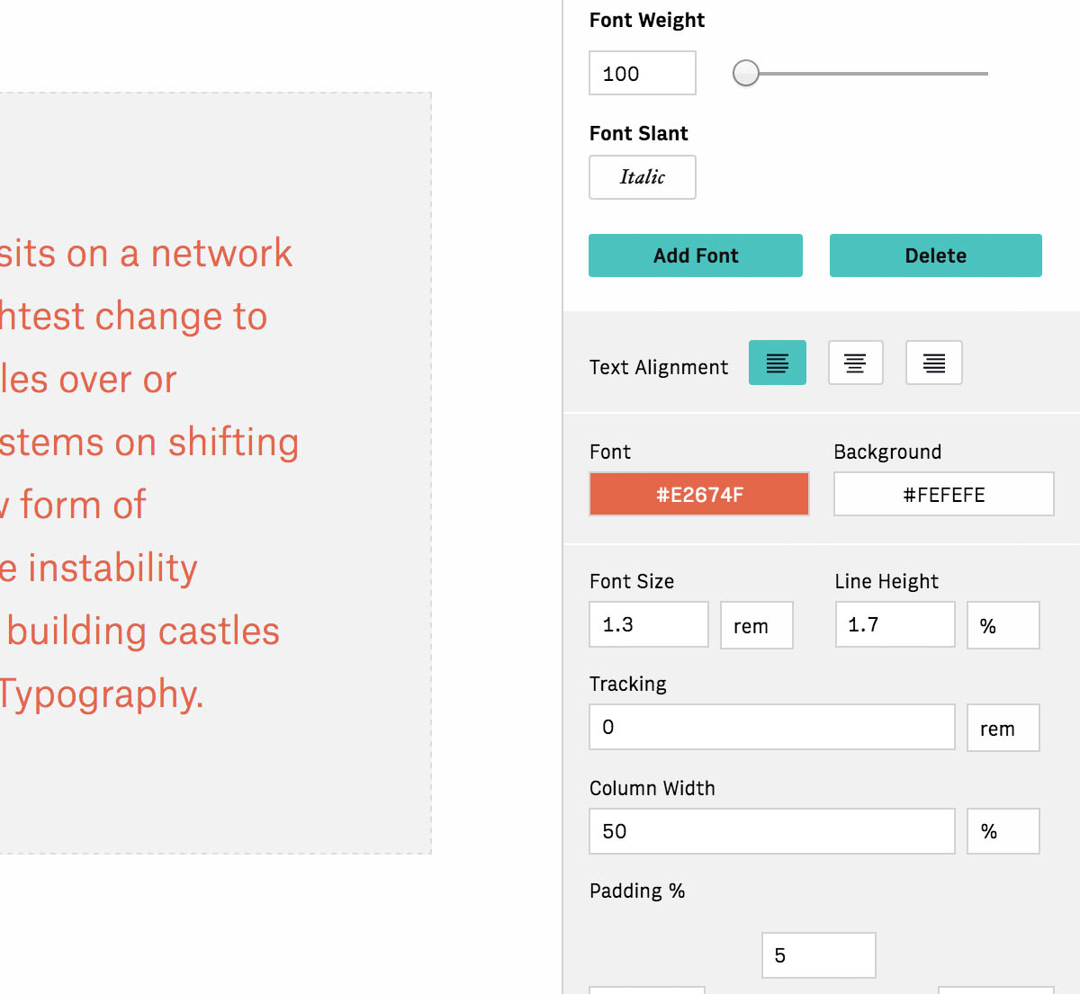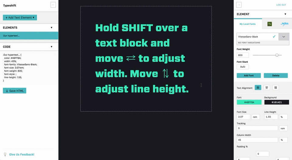 Moving seamlessly between Typeshift and production code is easy. Any design changes made in Typeshift are immediately reflected in the code panel for copy and pasting. Custom CSS class names can be added by double clicking on a text element and changing the name.