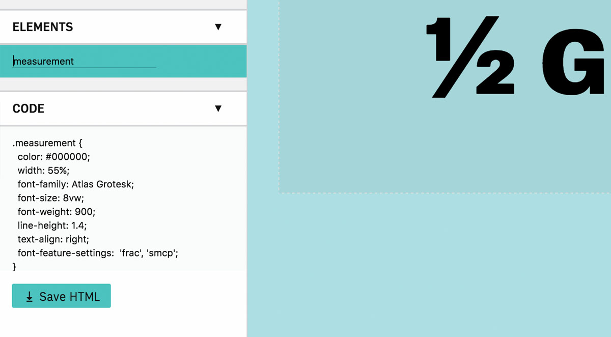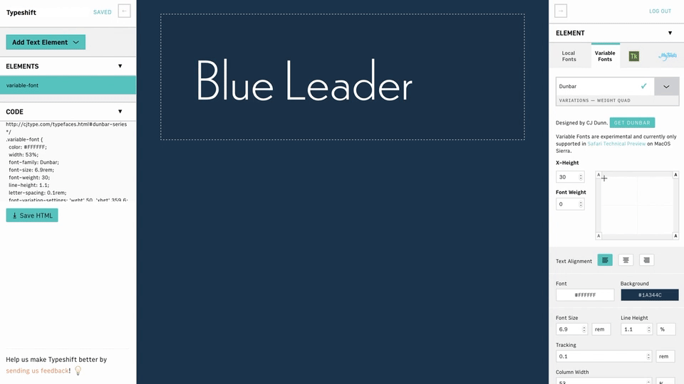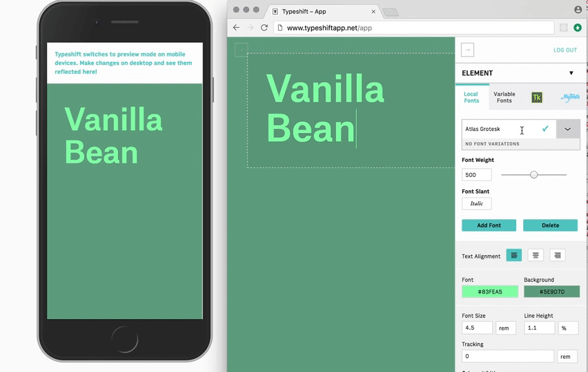 Everything in Typeshift is web native. CSS styles can be set on the sidebar and update the design live. This means you can open Typeshift in different browsers and resize the window to see how your fonts work responsively. You can also take advantage of relative and responsive viewport units like em and vmax!