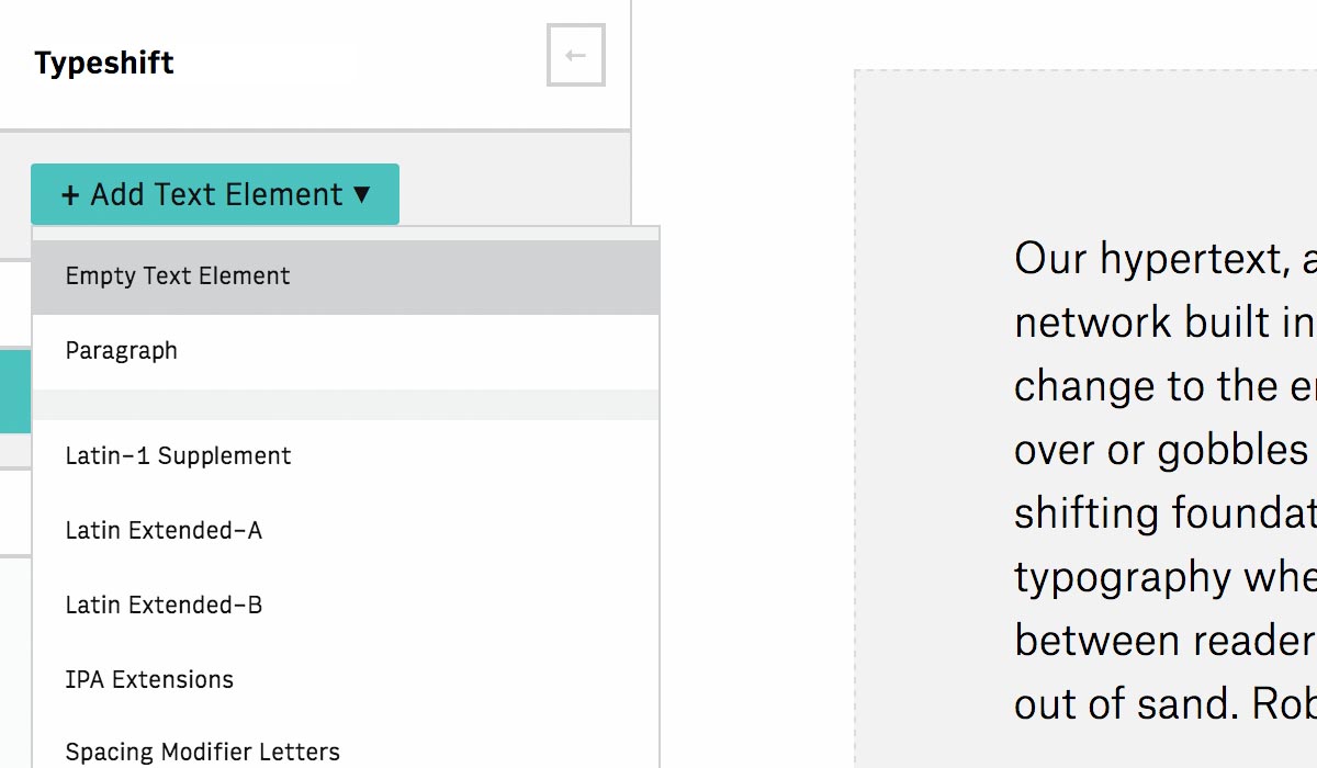 Text can be added easily by clicking the drop down in the top left. Empty text boxes and text boxes with placeholder text can be added this way. Placeholder content and other alternate characters and languages can be created this way as well if you’d like to test how a font supports these.